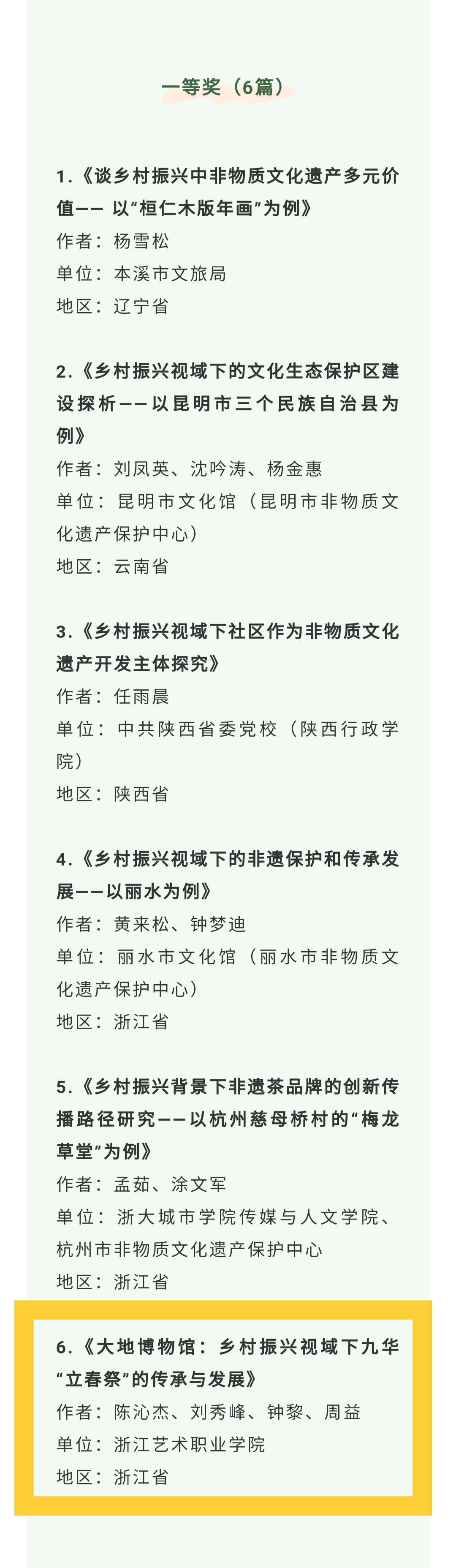 据悉,此次征文活动是第六届“大匠至心”非遗传承发展杭州沙龙的重要环节。活动面向全国征稿,从事非物质文化遗产保护、传承与发展研究、乡村振兴实践研究的单位和个人,均可投稿。近日,该活动落下帷幕,主办方共收到来自全国15个省市自治区80篇论文,经专家评审委员会认真评审,共评出获奖论文33篇。其中一等奖6篇,二等奖11篇,三等奖16篇。我校教师陈沁杰、刘秀峰、钟黎、周益撰写的《大地博物馆:乡村振兴视域下九华“立春祭”的传承与发展》获得征文一等奖,并将受邀参加第六届“大匠至心·非遗传承发展杭州沙龙”。
