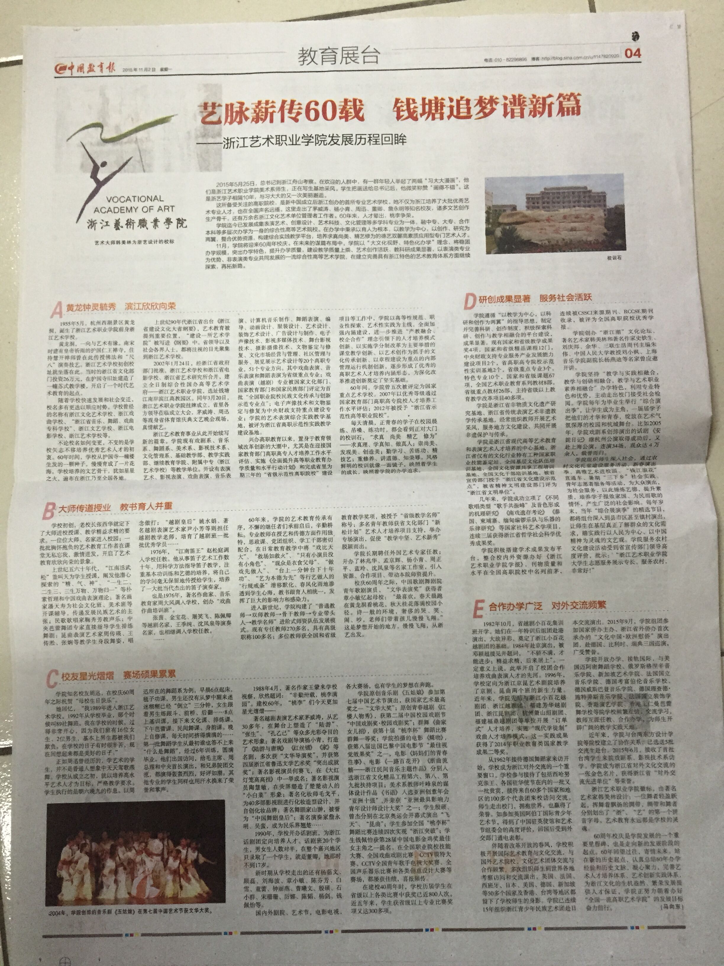 60周年校庆是学院发展的一个重要里程碑,也是走向新的发展阶段的起点。60年回望过往,寄情未来。站在新的历史起点,认真总结60年办学经验和历史文脉,凝心聚力、完善艺术人才培养体系、艺术创新实践体系,为浙江文化的生机盎然、繁荣发展提供人才保证,学院正努力朝着办好“全国一流高职艺术学院”的发展目标奋力前行。