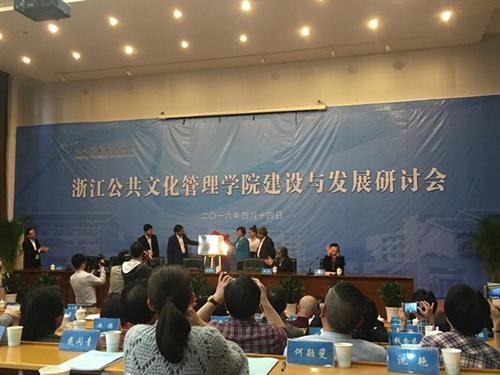 4月14日,浙江艺术职业学院举办了浙江公共文化管理学院挂牌仪式并举办研讨会。挂牌仪式由浙艺党委书记朱海闵主持,浙江省文化厅厅长金兴盛出席讲话,文化部公共文化司副司长陈向红、中央文化管理干部学院副院长李春华致贺词,浙艺院长张建国现场介绍了成立浙江公共文化管理学院的背景及未来发展目标等,之后共同为“浙江公共文化管理学院”揭牌。