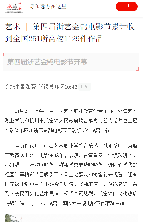 11月20日上午,由中国艺术职业教育学会主办、浙江艺术职业学院和杭州市瓶窑镇人民政府联合承办的苕溪话共富主题行动暨第四届浙艺金鹄电影节启动仪式在瓶窑举行。