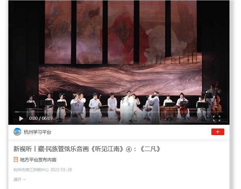 由浙江艺术职业学院、浙江歌舞剧院联合出品的民族管弦乐音画《听见江南》,挖掘整理了浙江丰沛的传统及地方音乐文化,有机融入浙派文化特有的美学意境和当代浙江鲜明的时代风貌,为观众呈现了一幅赏心、悦目、动听、怡情的江南音画。