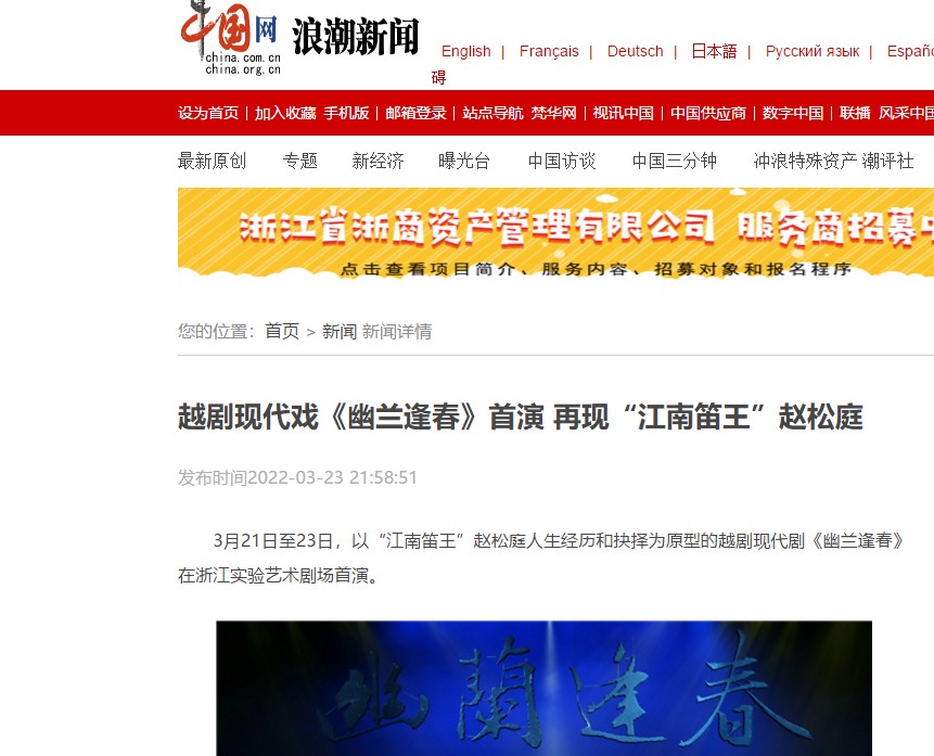 中国网浪潮新闻:越剧现代戏《幽兰逢春》首演 再现“江南笛王”赵松庭