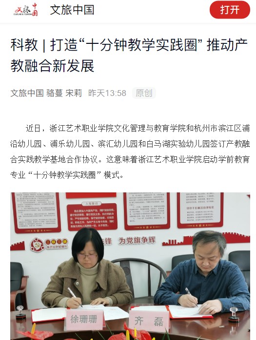 近日,浙江艺术职业学院文化管理与教育学院和杭州市滨江区浦沿幼儿园、浦乐幼儿园、滨汇幼儿园和白马湖实验幼儿园签订产教融合实践教学基地合作协议。这意味着浙江艺术职业学院启动学前教育专业“十分钟教学实践圈”模式。