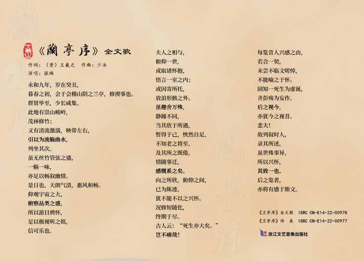 近日,一部由浙江艺术职业学院退休教师卢竹音(笔名少沐)作曲、指挥,绍兴小百花越剧艺术中心一级演员张琳演唱、绍兴小百花越剧艺术中心乐队伴奏的《兰亭序全文歌》问世,其演唱、伴奏版(U盘版)由浙江文艺音像出版社出版发行。