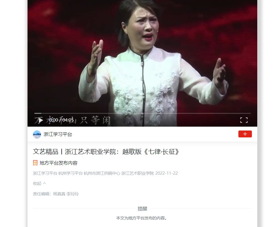 学习强国浙江平台:文艺精品丨浙江艺术职业学院:越歌版《七律·长征》