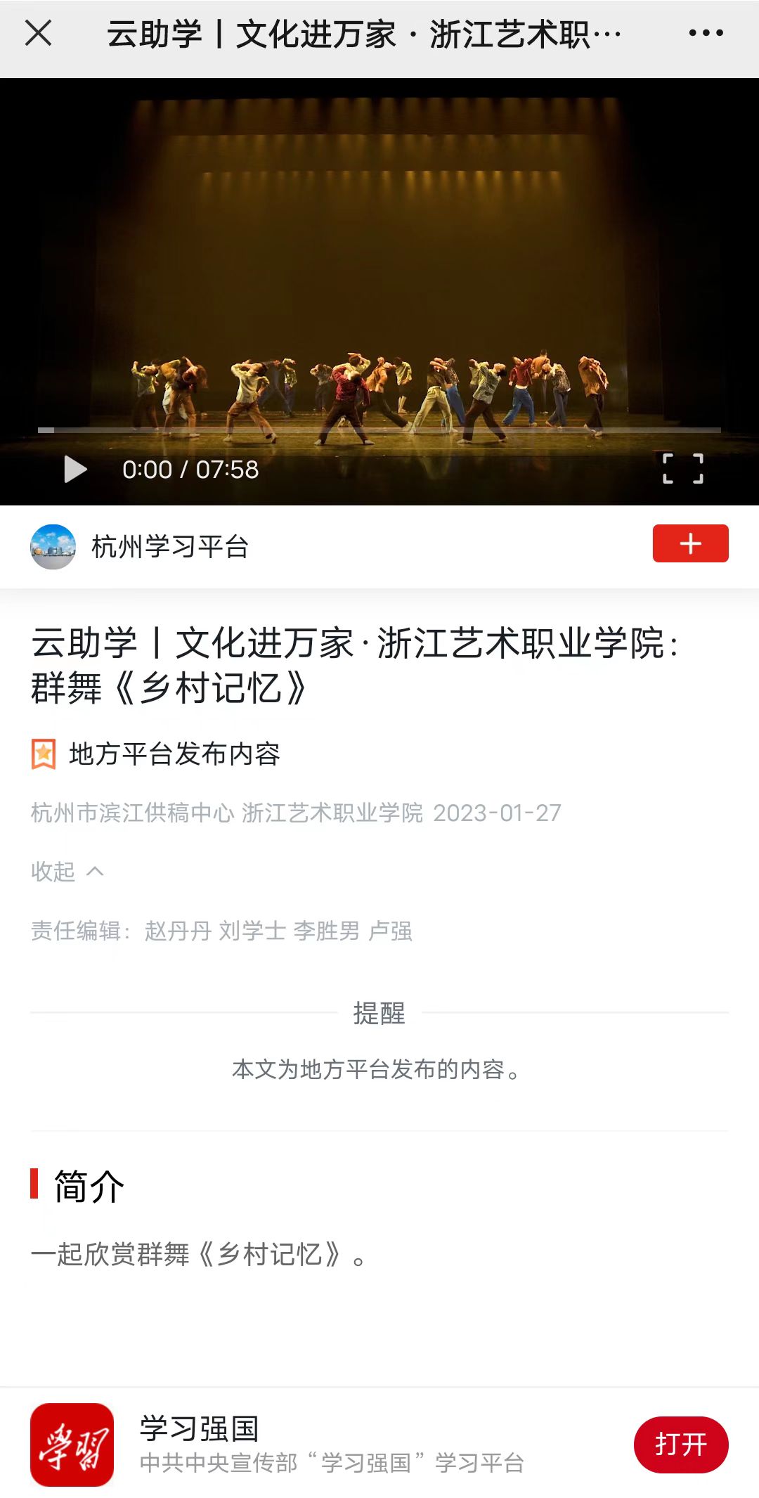 学习强国杭州平台:云助学丨文化进万家·浙江艺术职业学院:群舞《乡村记忆》