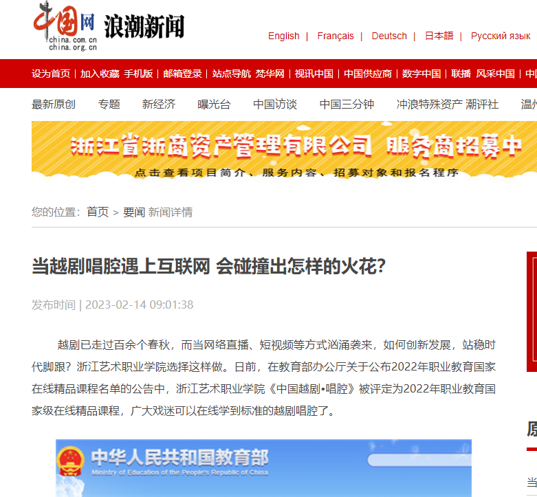 越剧已走过百余个春秋,而当网络直播、短视频等方式汹涌袭来,如何创新发展,站稳时代脚跟?浙江艺术职业学院选择这样做。日前,在教育部办公厅关于公布2022年职业教育国家在线精品课程名单的公告中,浙江艺术职业学院《中国越剧•唱腔》被评定为2022年职业教育国家级在线精品课程,广大戏迷可以在线学到标准的越剧唱腔了。