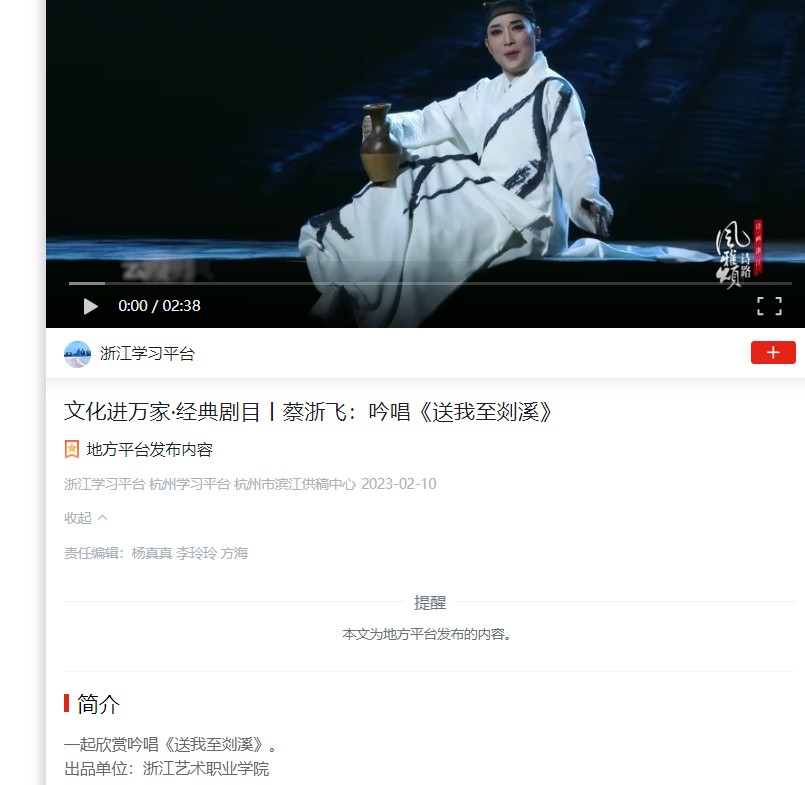 学习强国浙江平台:文化进万家·经典剧目丨蔡浙飞:吟唱《送我至剡溪》