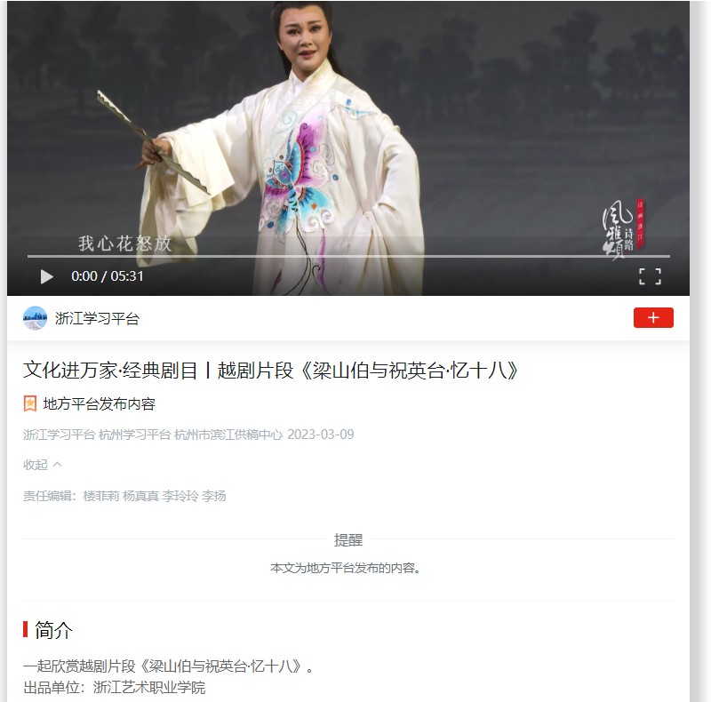 学习强国浙江平台:文化进万家·经典剧目丨越剧片段《梁山伯与祝英台·忆十八》