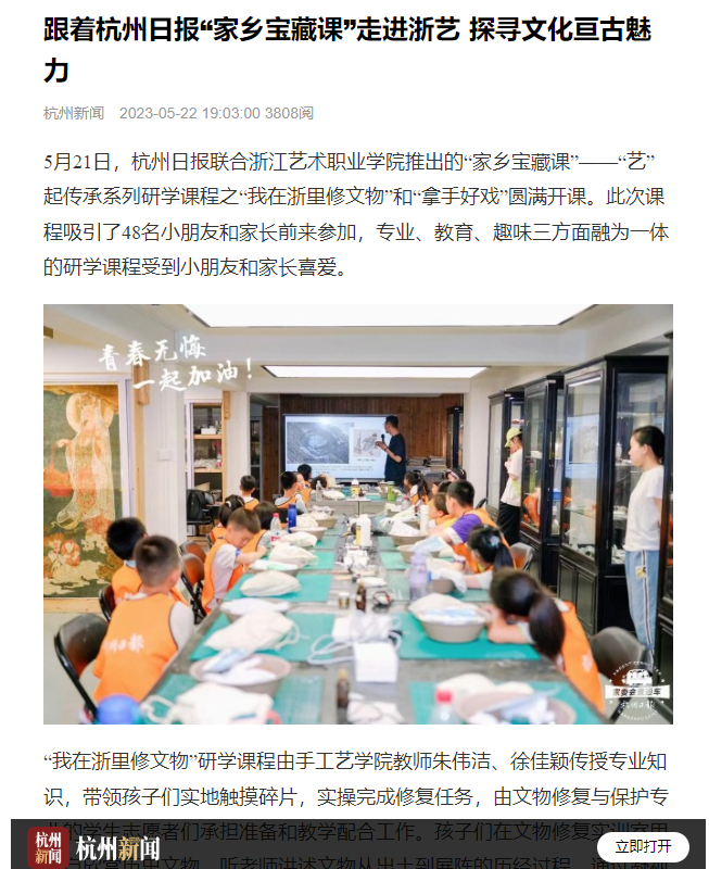 5月21日,杭州日报联合浙江艺术职业学院推出的“家乡宝藏课”——“艺”起传承系列研学课程之“我在浙里修文物”和“拿手好戏”圆满开课。此次课程吸引了48名小朋友和家长前来参加,专业、教育、趣味三方面融为一体的研学课程受到小朋友和家长喜爱。