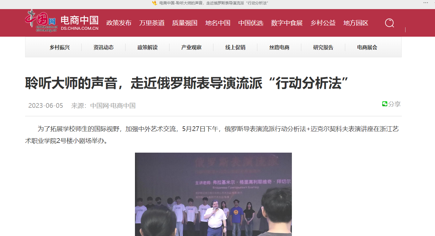 为了拓展学校师生的国际视野,加强中外艺术交流,5月27日下午,俄罗斯导表演流派行动分析法+迈克尔契科夫表演讲座在浙江艺术职业学院2号楼小剧场举办。