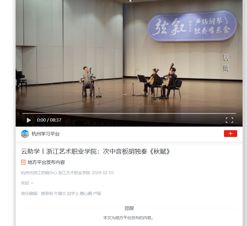 学习强国杭州平台:云助学丨浙江艺术职业学院:次中音板胡独奏《秋赋》