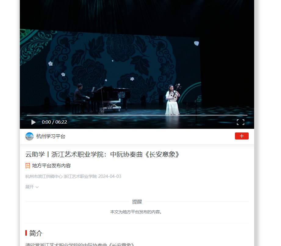 学习强国杭州平台:云助学丨浙江艺术职业学院:中阮协奏曲《长安意象》