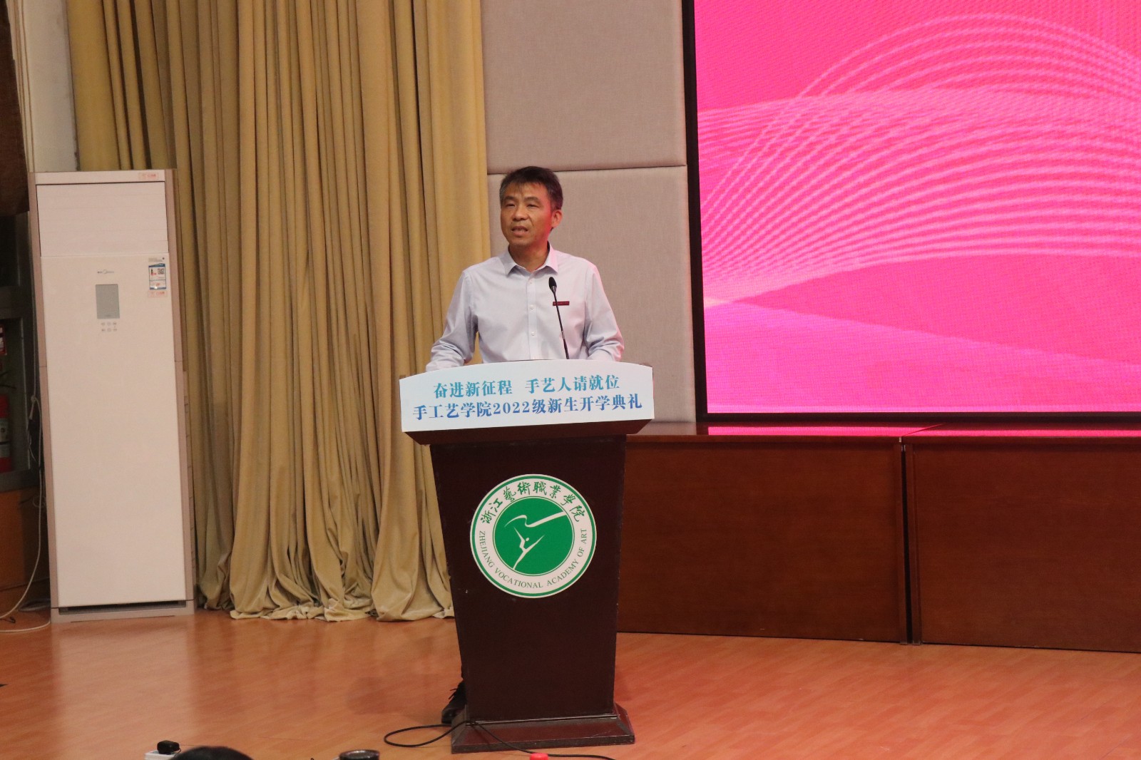 典礼现场,沈军甫代表学校对手工艺学院168位新生的到来表示欢迎。他表示手工艺学院秉承文化传承使命,坚持守正创新,致力于传统手工艺非遗传承。作为新时代的浙艺手艺人,应以青年之力、新人之姿,投入到非遗文化的保护与传承中去。他向新生学子们提出三点期望:一要永葆自律自强、坚定文化自信;二要乐于勤学善思,坚持守正创新;三要体悟非遗之美,弘扬传统文化。愿同学们坚守初心,在浙艺这个梦想开始的地方启航新征程。