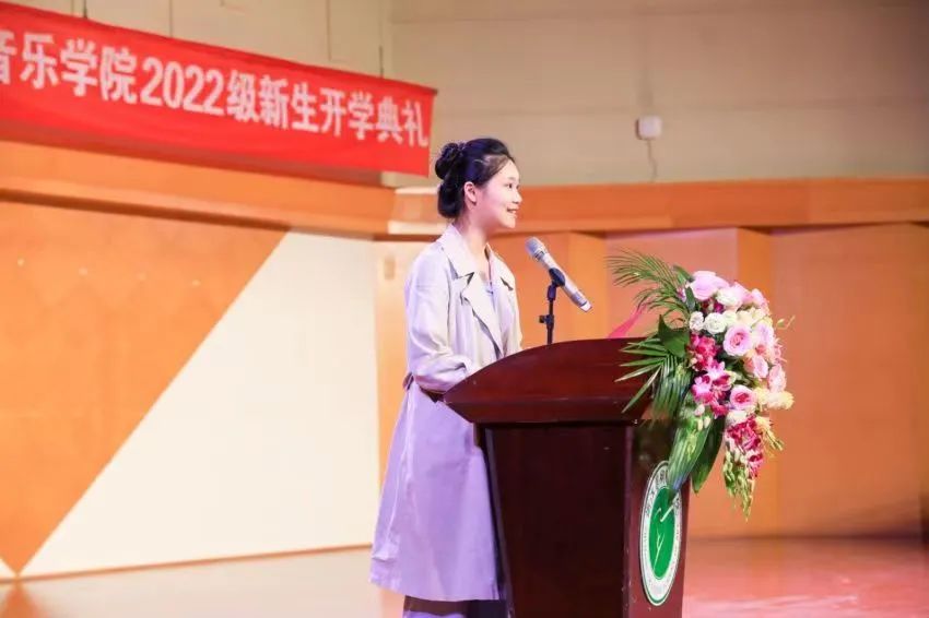22声乐1班周俐彤同学代表新生发言。她以《青春起航 共著华章》为题,倡议全体新同学要明确目标,培养习惯;独立思考,历练成人;开阔视野,博学多才。