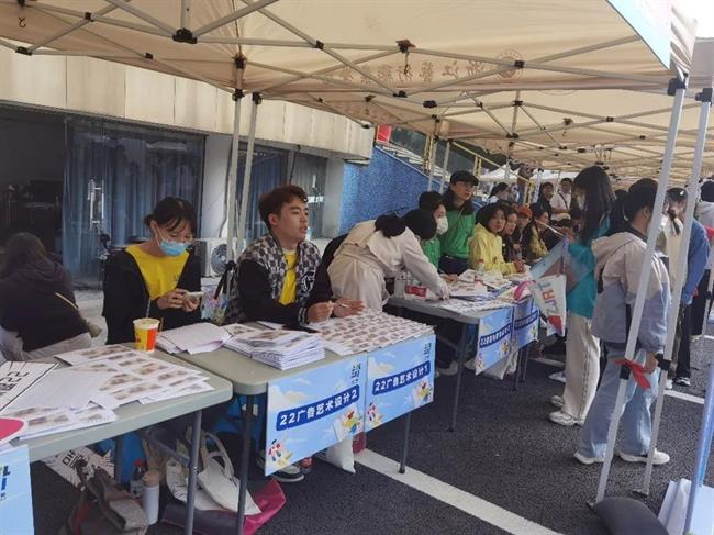 设计学院报到处,各式迎新宣传随处可见,迎新氛围浓厚,仪式感满满,吸引众多新同学打卡拍照。