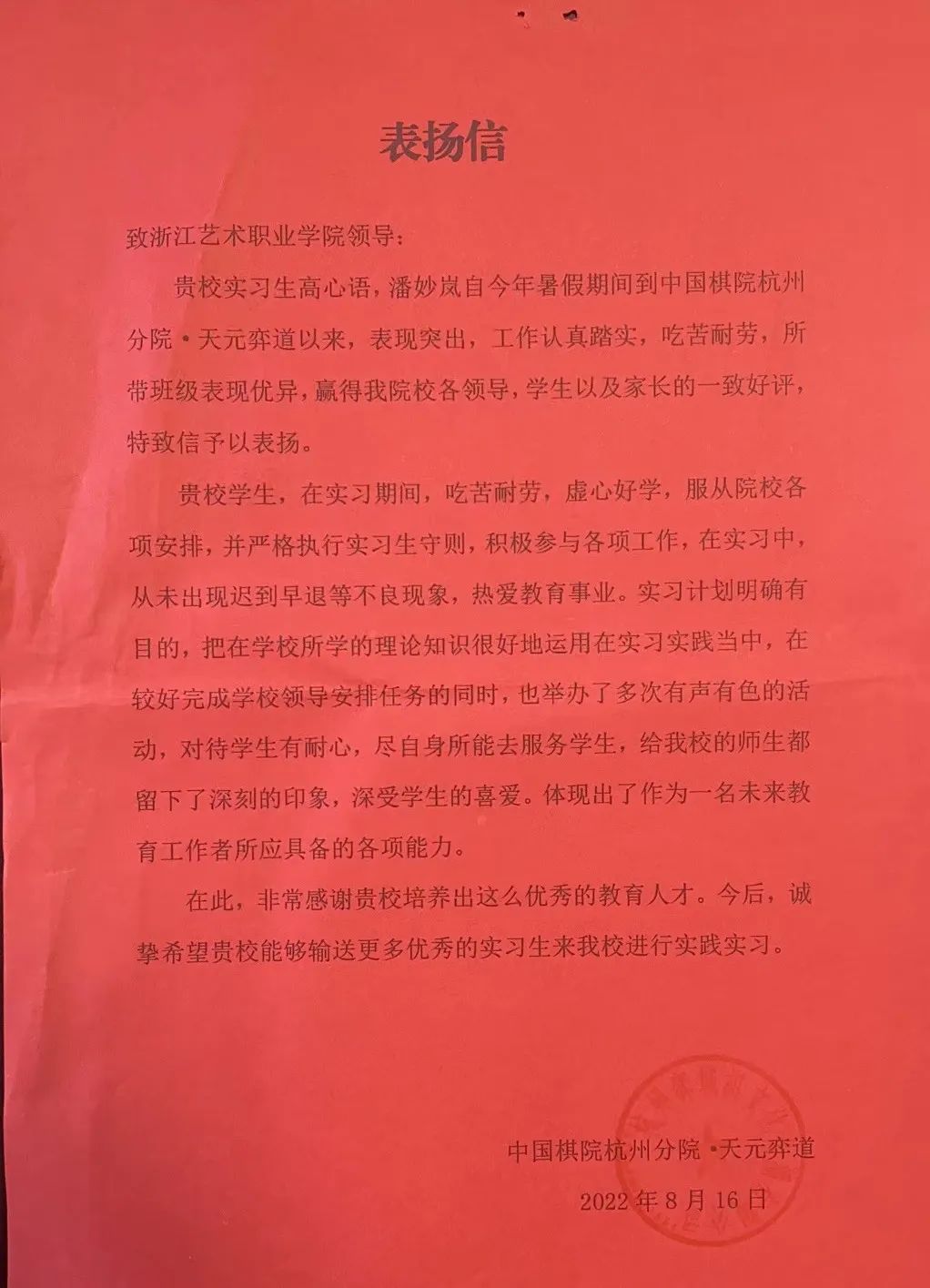 天元奕道·中国棋院杭州分院作为国内权威的棋类培训机构,在近年的国内外各类比赛中取得了骄人的成绩,夺得了2009年全国围棋甲级联赛冠军,为杭州、为国家培养输送了大量棋类人才,为杭州的棋文化品质生活作出了贡献。2022年暑期夏令营,学前教育学生前往棋院见习,棋院表示我院学子认真负责、热情耐心的品质与突出的专业水平正是他们所需要的当代大学生人才。