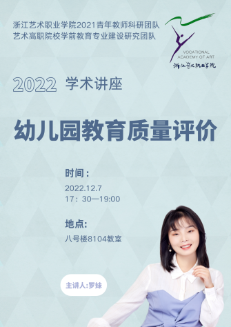 为提高学前教育专业学生的专业知识,让其深入了解幼儿园教育质量的评价标准,12月7日,浙江艺术职业学院2022年度青年教师科研团队“艺术高职院校学前教育专业建设研究团队”教师罗妹带来题为《幼儿园教育质量评价》的学术讲座。