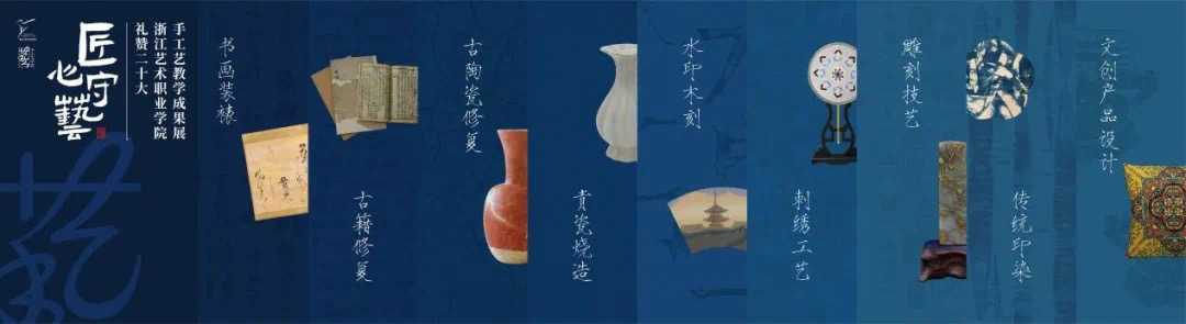 本次教学成果展共分为十一个板块,涵盖古陶瓷修复、古籍修复、书画装裱、青瓷烧造、传统印染、刺绣工艺、水印木刻、雕刻技艺等八个技艺教学成果以及非遗文创产品设计、非遗传承人群研培、优秀校友作品等。通过本次展览,希望激励手工艺学院全体师生员工继续秉承“立德树人”的初心,着力探索手工艺传统传承方式与现代职业教育体系建设深度融合的人才培养新模式,大力培养非遗传承人群、非遗文创开发人员等人才,全面开展非遗保护、传承、研究和传播工作,助力浙江非遗强省建设。