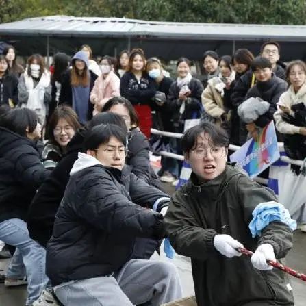 拔河比赛在现场热烈高涨的气氛中正式开始,七支队伍按抽签结果进行角逐。随着比赛哨声的响起,场内的呐喊声与加油声此起彼伏,双方队员紧握手中的长绳,弯腰扎步,卯足劲齐心协力往后拔。场边的老师和同学也不遗余力地为场上选手助威鼓劲,在红绳过线的那一刻兴奋欢呼,为获胜方喝彩,也为落败方鼓掌叫好。