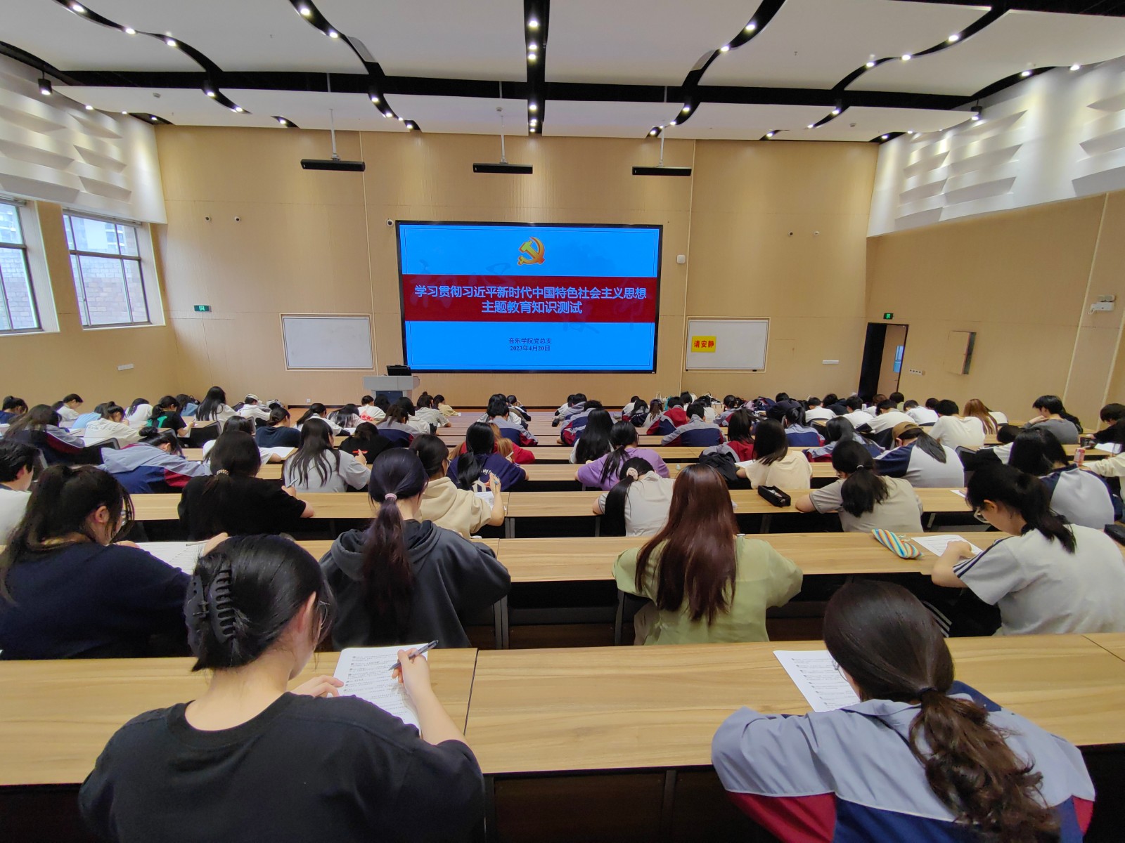 本次理论测试采用闭卷形式,内容丰富,针对性强,主要围绕习近平新时代中国特色社会主义思想,党的二十大精神等内容。全面测试音乐学子政治理论水平和运用理论解决实际问题的能力。考试期间,同学们态度严肃认真,严格遵守考试流程及规定,谨慎作答。监考员格尽职守,严抓考风考纪,考试过程井然有序。