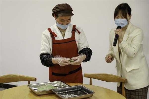 活动现场,热闹非凡。食堂师傅为大家详细讲解做青团的步骤,包括面团的揉搓方法、青团的包制手法和蒸制方式等。师生们相互配合、团结协作、忙活开来:倒糯米粉、拌艾草汁、揉搓成团、擀皮包馅……互相诉说着自己家乡清明节的习俗。
