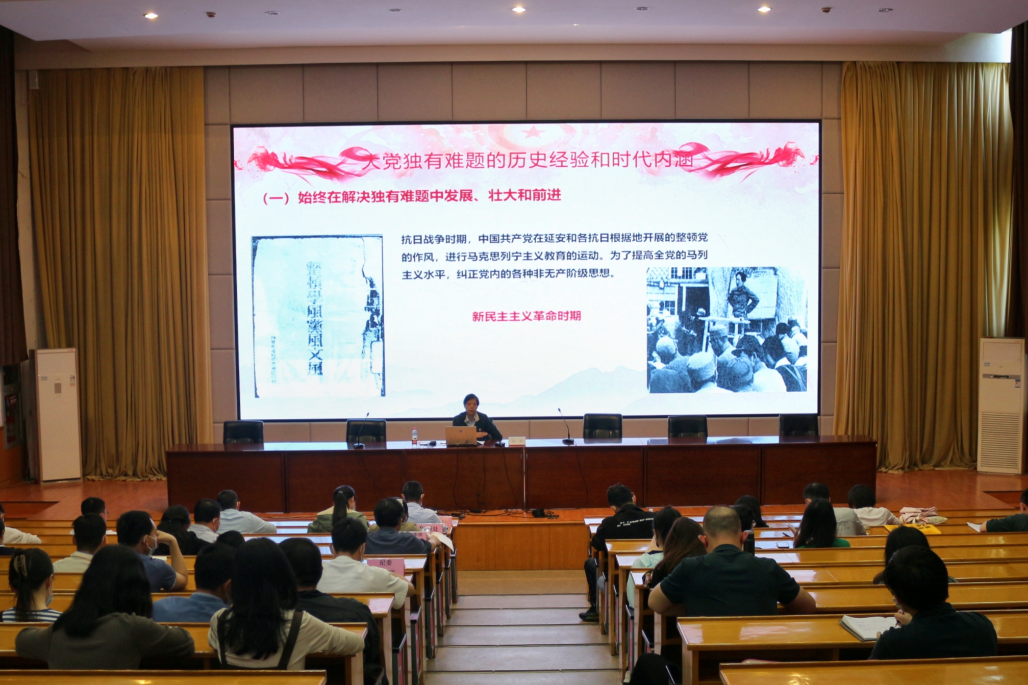 徐芳以《“大党独有难题”的时代答案》为题,结合主题教育相关要求,就大党独有难题的历史经验和时代内涵、提出大党独有难题的时代原因、破解大党独有难题的时代答案等三个方面与现场教师进行分享交流。