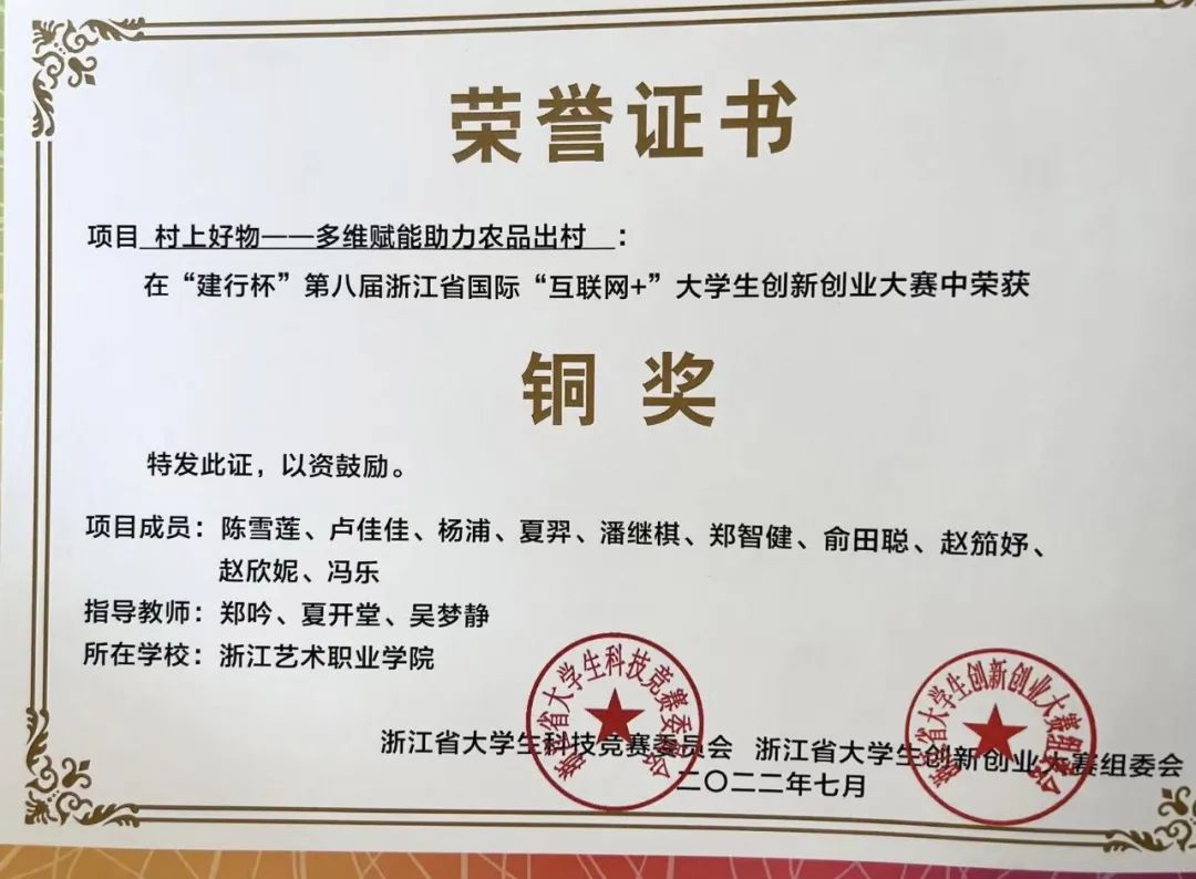 团支部全体团员积极参与校内学生工作和各类文体竞赛。2022年度,团支部个人先进荣誉获奖达35人次,其中1人获省政府奖学金、19人获校级奖学金、1人获“优秀团干部”称号、2人获“三好学生”荣誉称号。在各类文体竞赛中,团支部共获20项荣誉,如:军训会操“先进集体”、内务评比“先进集体”、挑战杯创新创业大赛银奖、浙江省第八届国际互联网+创新创业大赛铜奖、校“卡尔·马克思杯”理论知识竞赛一等奖、校“我在浙艺话共富 青春奋进新征程”主题征文一等奖、“献礼二十大 舞台上的思政课”三等奖等。