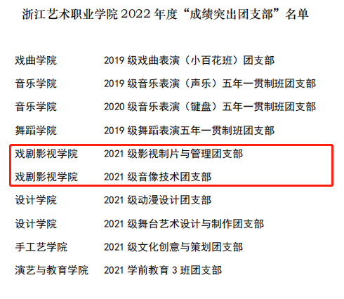 近日,共青团浙江艺术职业学院委员会发文表彰了2022年度浙江艺术职业学院共青团和青年工作成绩突出集体和个人,戏剧影视学院2021级影视制片与管理班团支部、2021级音像技术班团支部获评“成绩突出团支部”。