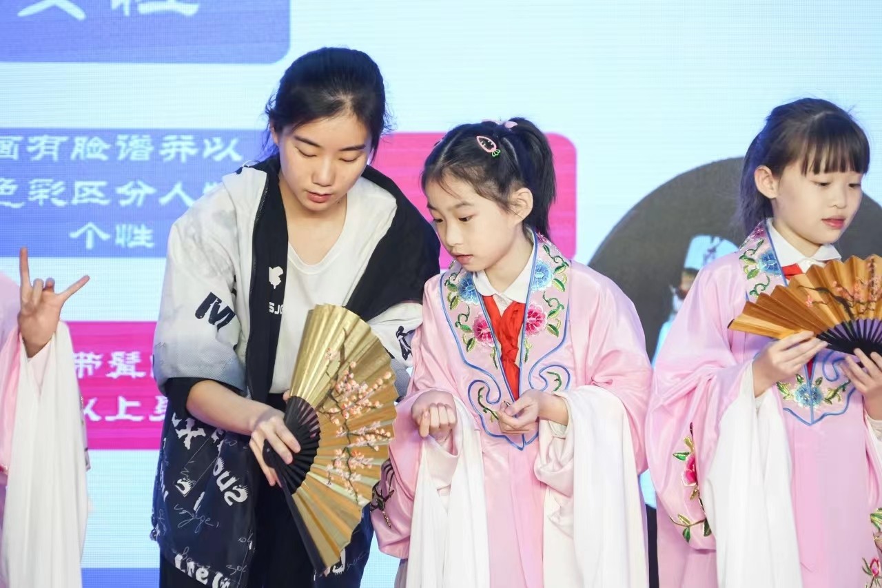 12名四年级的同学毛遂自荐,跟随昆曲班的两位师姐学习《牡丹亭·游园》经典动作,切身体验了一把昆曲表演艺术。