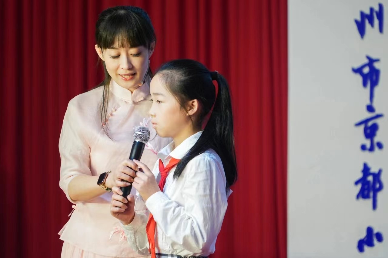 洪俊致辞。她首先代表京都小学全体师生对拱墅区文联、浙江艺术职业学院的领导和艺术家们多年以来对京都小学昆曲发展的关心和支持致以最衷心的感谢。她表示,京都小学一直非常重视传承和发扬祖国传统文化,通过多年的积累和积淀,已培养昆曲小爱好者600多名。如今人人知晓昆曲,人人会跳昆曲拳操,昆曲已成为京都小学一张响当当的艺术金名片。