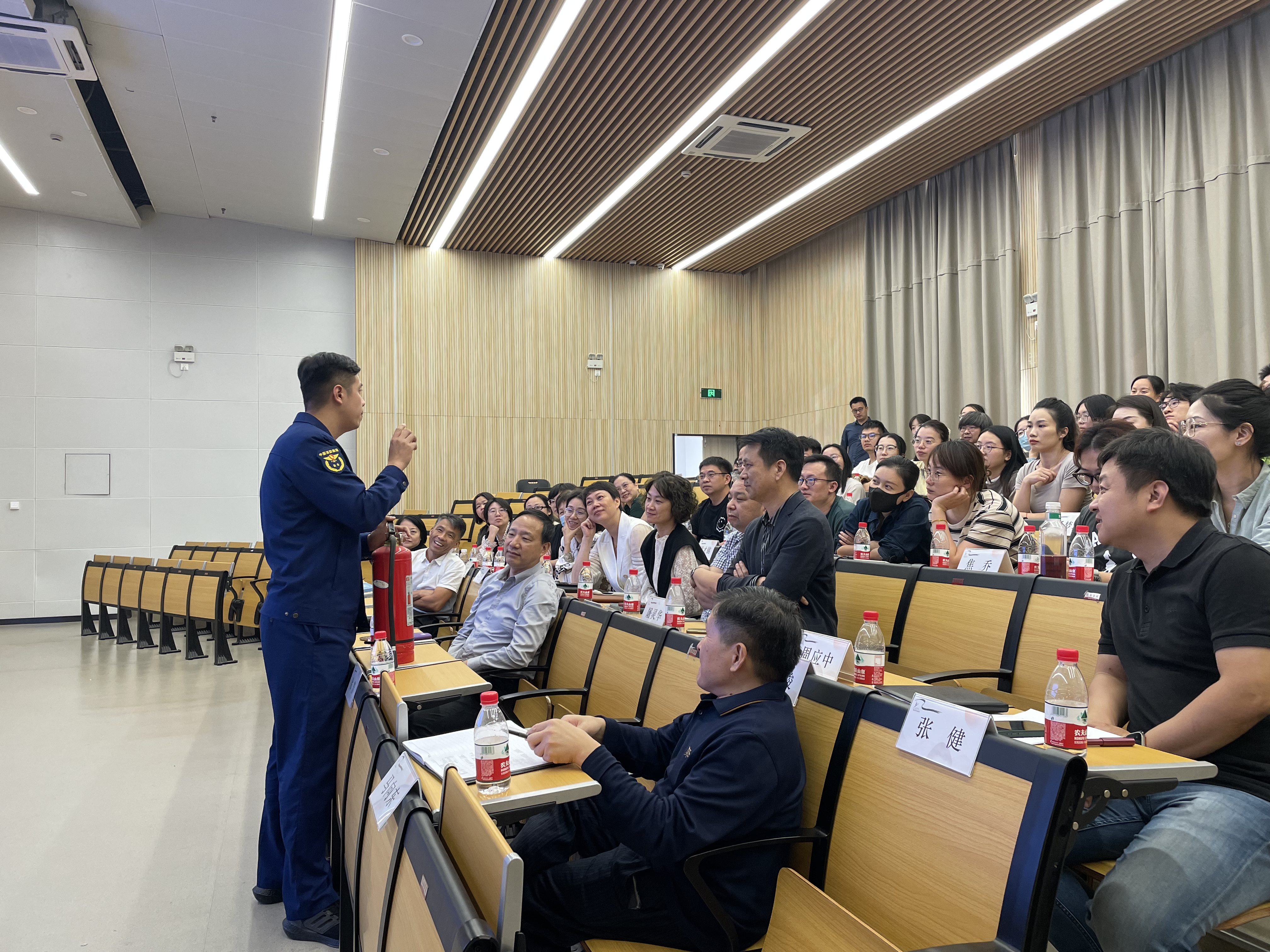 章一立讲解了基本的消防知识,如火灾发生的原因、火灾预防、火场逃生、灭火器的正确使用等内容。他从理论上向大家传授应对火灾的基本知识与技能,并现场示范了正确使用灭火器的方法,参训人员切实体会到了基本消防安全知识的重要性。章一立还列举了近期因缺乏相关消防知识而发生的惨痛“悲剧”,讲述了消防员牺牲的英雄事迹。