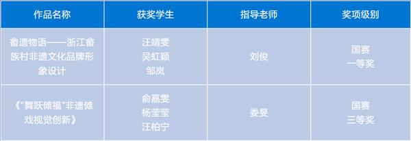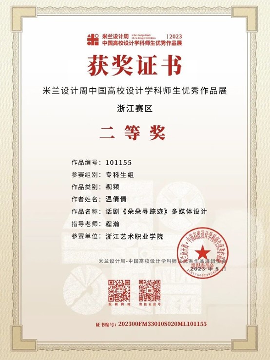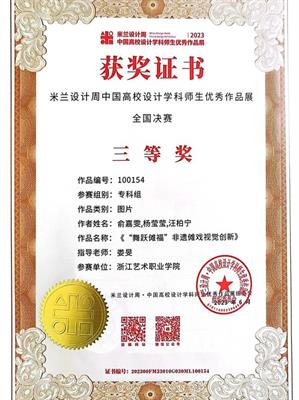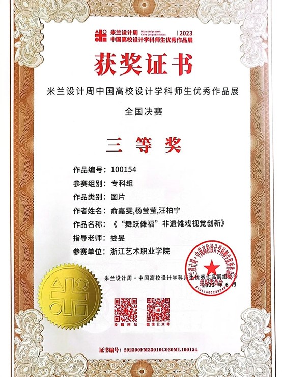 为提高学生运用知识解决实际问题的能力,积极鼓励学生参加各类专业竞赛,培养具有创新精神和实践能力的高素质技术技能人才。近日,由设计学院各专业教师指导的学生作品在2023“米兰设计周——中国高校设计学科师生优秀作品展”中喜获佳绩。经过校内选拔、浙江赛区选拔,作品获得国赛一等奖1项,三等奖1项;浙江赛区获省一等奖1项、二等奖4项、三等奖5项的好成绩。