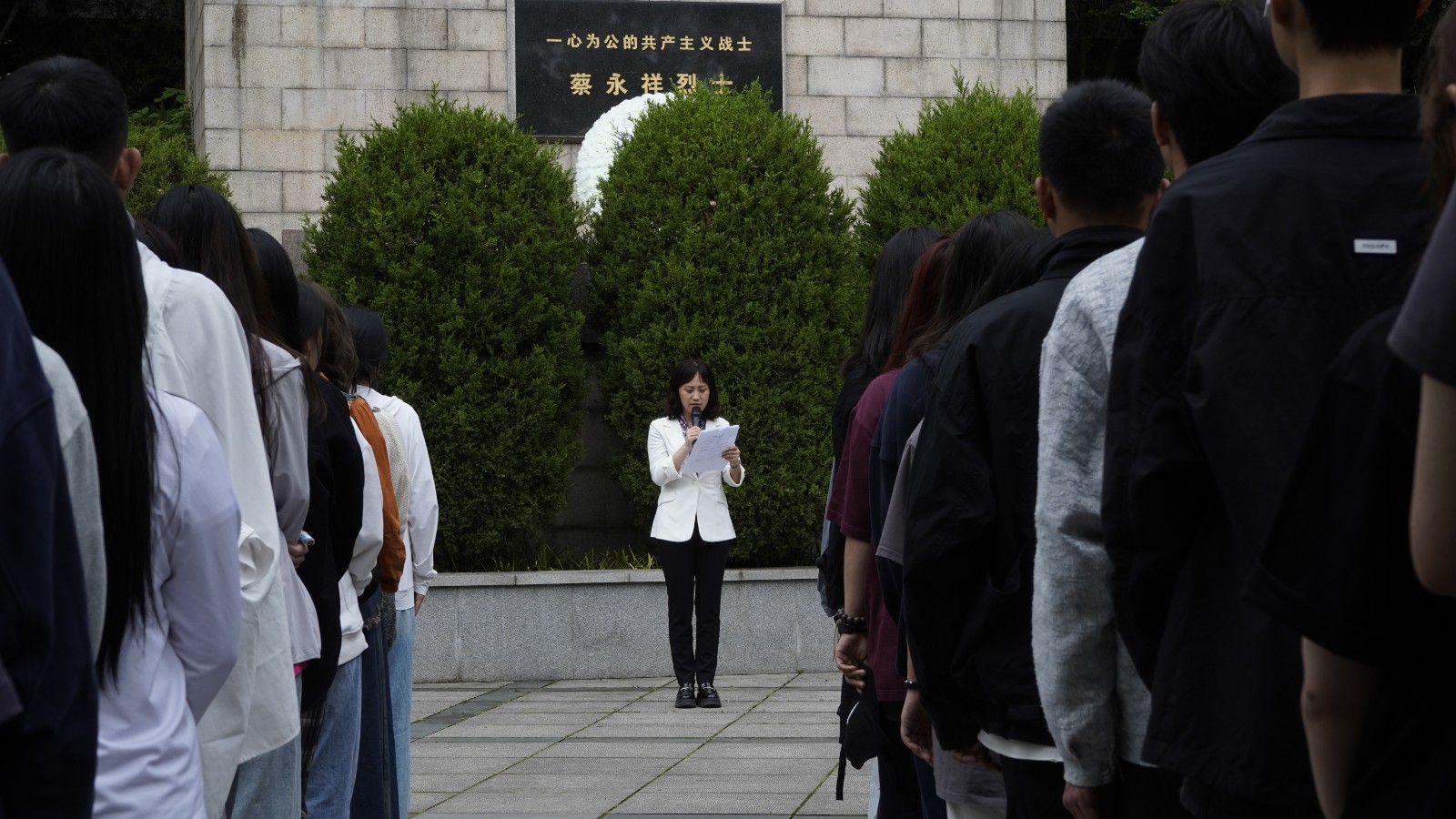 参观完毕,党校全体师生在蔡永祥烈士纪念碑前举行祭奠仪式。全体学员们行注目礼,两位党校学员代表向革命烈士敬献花篮,全体师生向烈士行三鞠躬礼,低头默哀,随后绕纪念碑一圈,瞻仰烈士像。