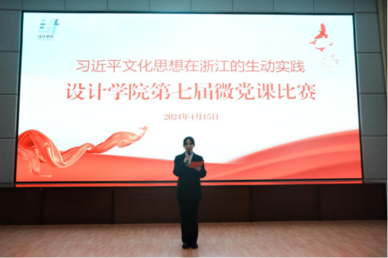 为深入学习贯彻习近平文化思想,丰富党课教育内容,创新党课教育形式,深化学生对习近平文化思想在浙江生动实践的认识,续写新时代浙江文化繁荣兴盛的新篇章,4月15日,设计学院“习近平文化思想在浙江的生动实践”第七届微党课比赛在学校图信报告厅举行。马克思主义学院副院长胡卓群,设计学院党总支书记汪琳,党总支副书记汪仕龙,副院长何佳玮,党总支委员、教工第二党支部书记贾娜娜,学生党支部书记龚林峰出席并担任评委。辅导员、学生党员、第43期党校学员、“正青春”青年理论学习小组成员、青年团员现场观摩学习。