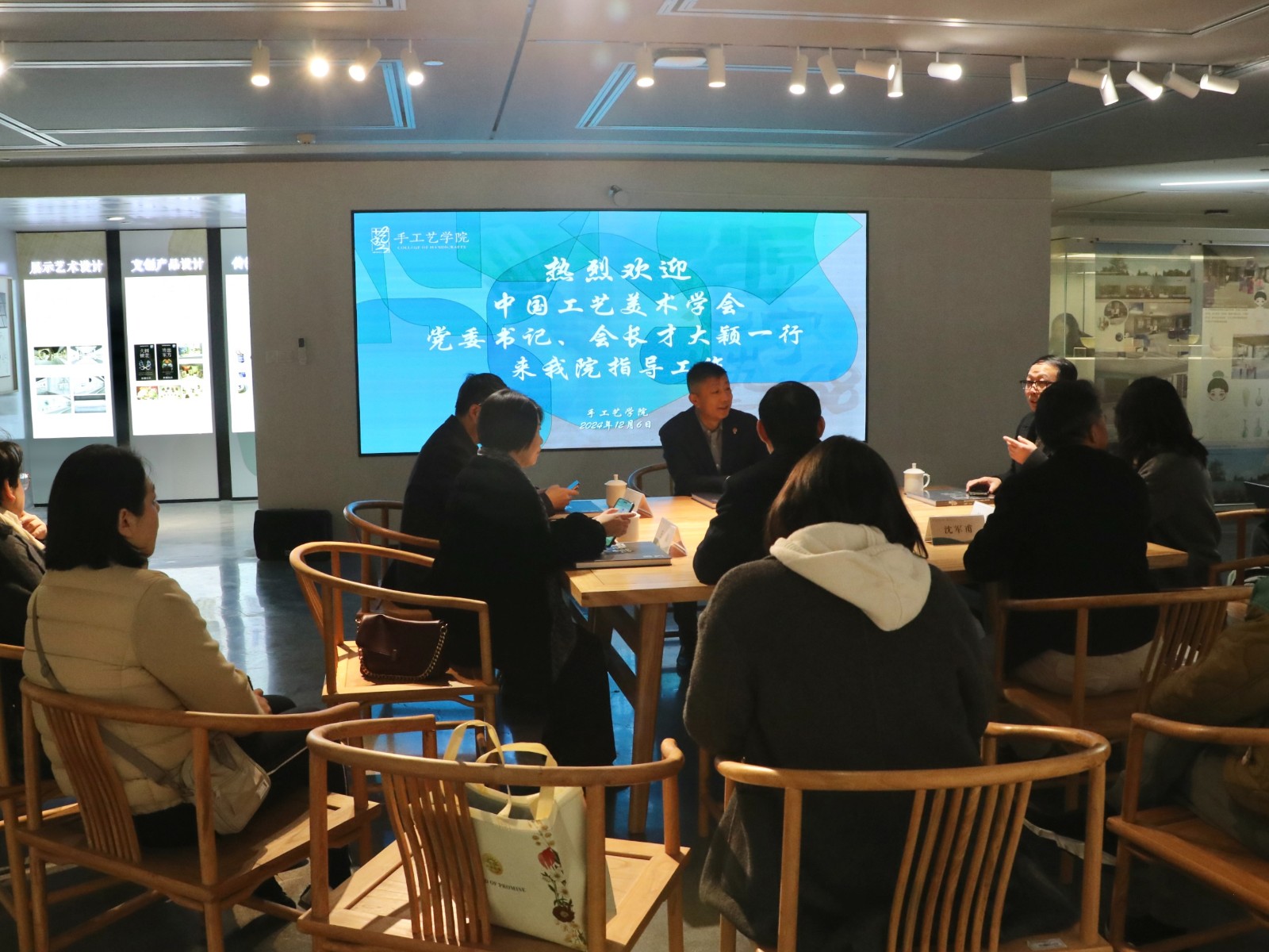 12月6日上午,首批中国工艺美术学会游学基地揭牌仪式、参观活动以及专题讲座在手工艺学院举行。中国工艺美术学会党委书记、会长才大颖,浙江省二轻集团党委副书记、总经理,省工艺美术学会会长吴敏、省工艺品进出口公司党委书记、董事长,省工艺美术研究院党委书记、院长王磊,浙广传媒股份有限公司董事长,浙江工艺美术杂志社总编辑郭城,浙江艺术职业学院校长施俊天、纪委书记沈军甫参加了活动与讲座。