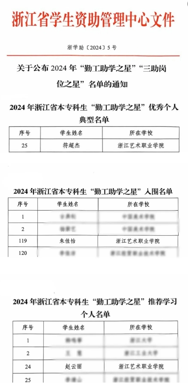 符超杰获评2024年浙江省本专科生“勤工助学之星”优秀个人典型,赵丽云获评2024年浙江省本专科生“勤工助学之星”推荐学习个人,朱佳怡荣获2024年浙江省本专科生“勤工助学之星”入围。