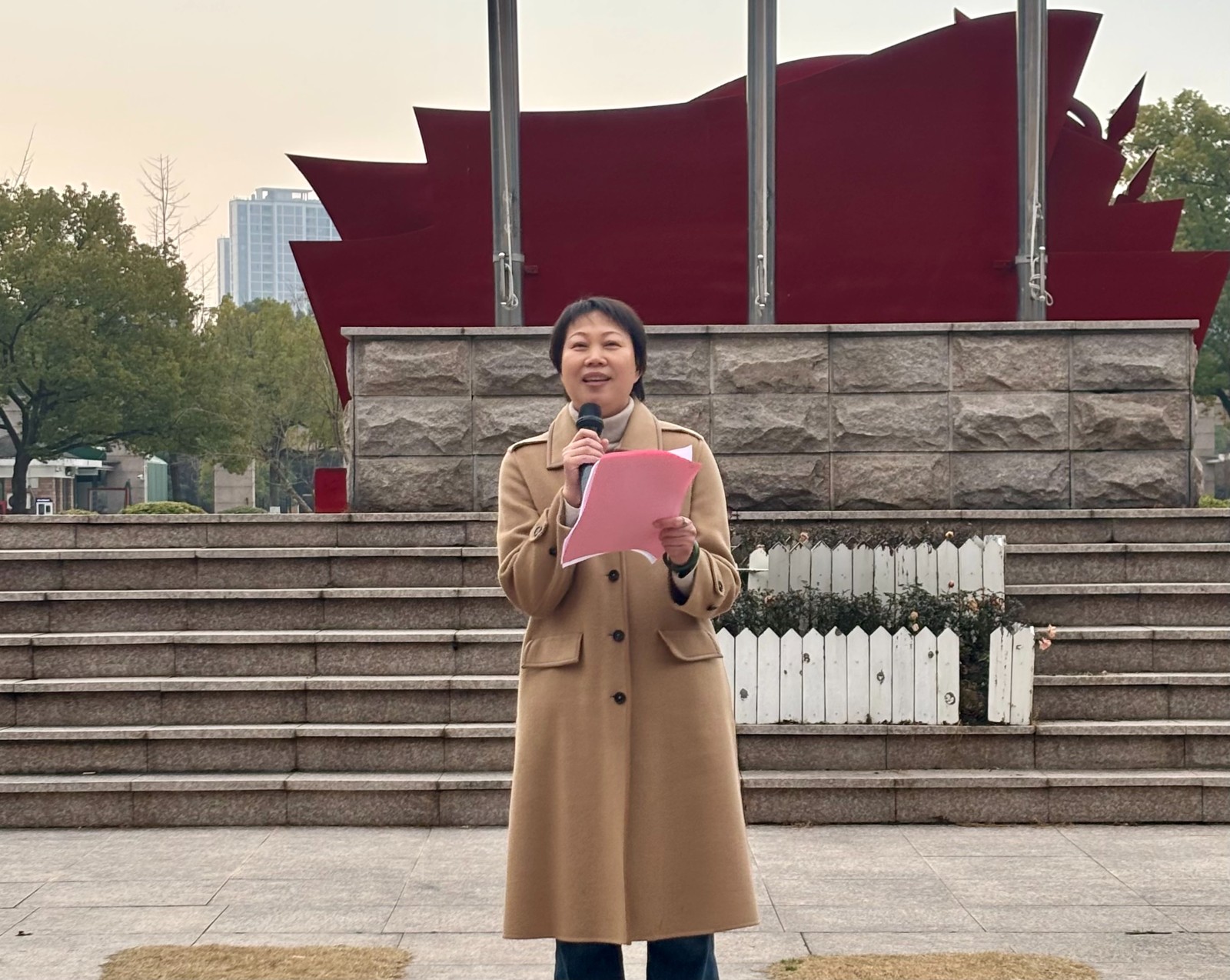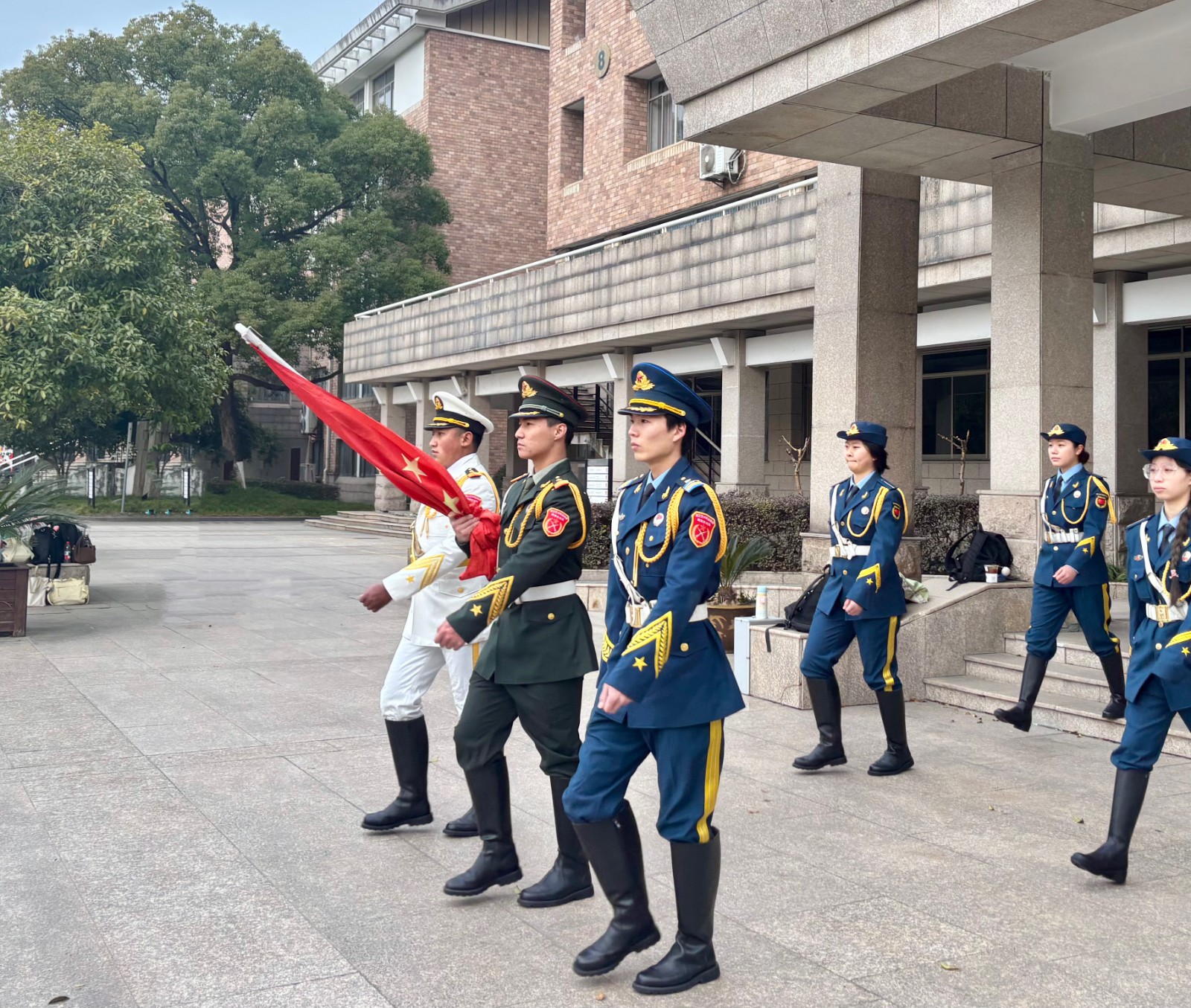 国旗护卫队迈着整齐有力的步伐护送国旗走向升旗台。随着激昂的国歌声响起,五星红旗冉冉升起,全体师生庄严肃立,向国旗行注目礼,高唱国歌。这一刻,爱国之情在每个人心中激荡,也为新学期注入了满满的正能量。