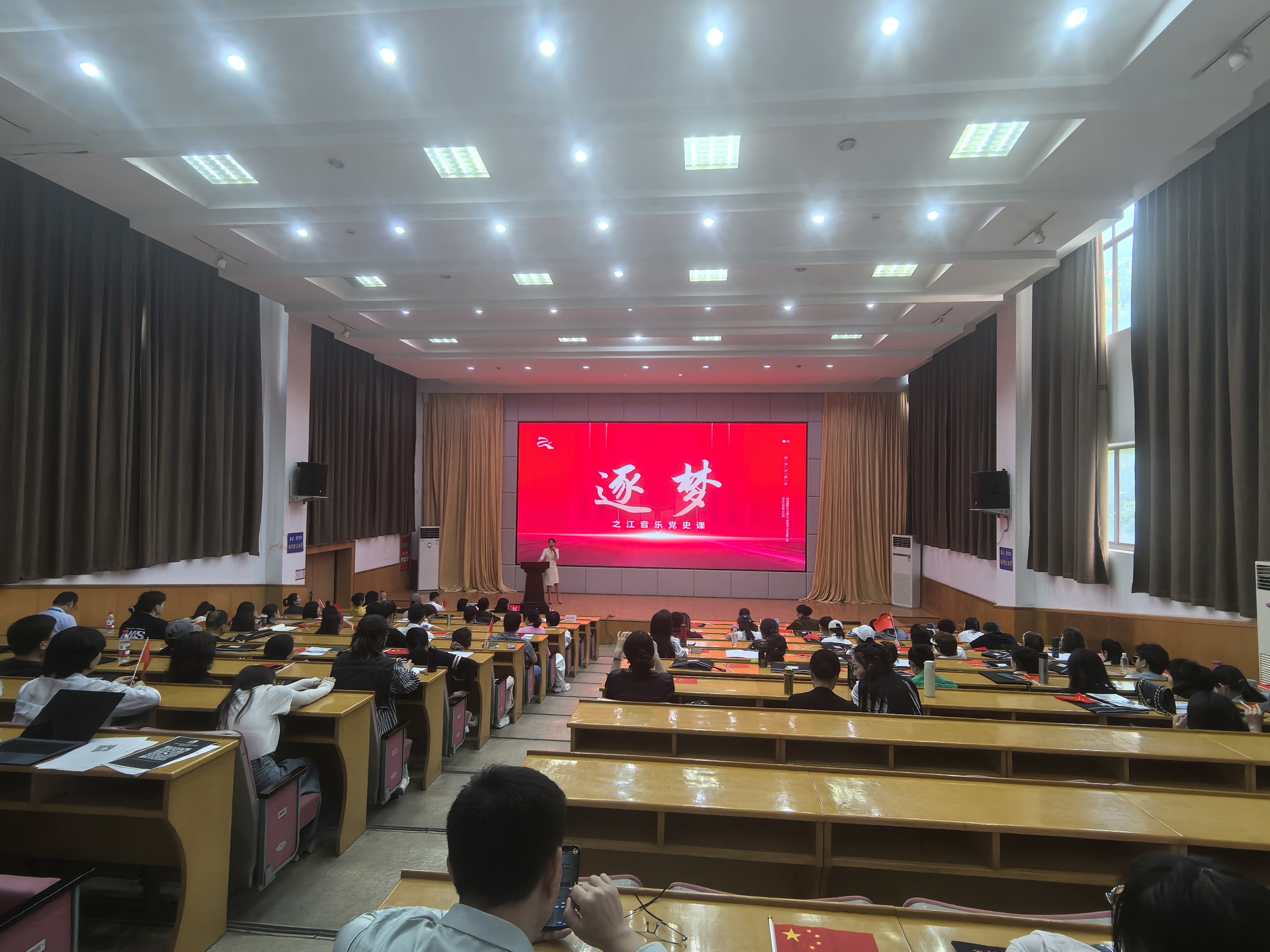 5月12日,由浙江广电集团音乐调频带来的“之江音乐党课”在浙江艺术职业学院图信报告厅上演。有别于传统党课,本次音乐党课形式别出心裁,汇集音乐、朗诵、表演等多种元素。学员们纷纷表示这个党课形式特别、很有吸引力,用生动的语言与内容充实了思想。音乐党课结束时,台上的演员与台下的学员更是共唱一首歌赞颂祖国,现场挥舞的红色国旗传递了浓浓的爱国热情。同时,2025年全省民营文艺表演团体优秀剧团演员(曲艺、服装和化妆)培训班正式拉开帷幕。