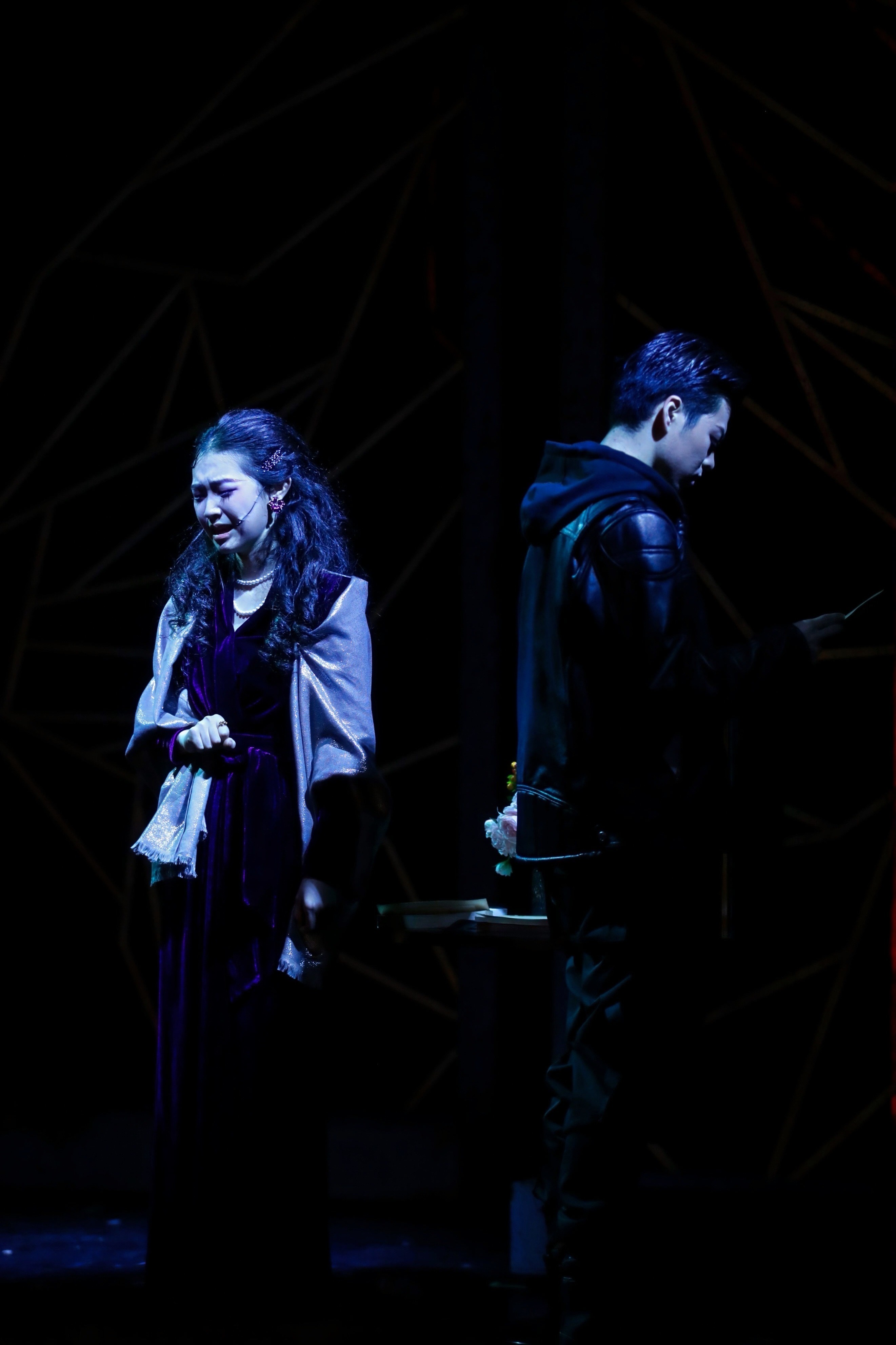 改编后的《杀手的礼物》,既忠于原著核心,又赋予舞台独有的生命力。剧中延续了原著“代号‘礼物’的杀手以特殊反转规则立足黑暗世界”核心设定的同时,用四段直击人心的单元故事,编织出立体的人文图景:青怡想借反转规则拯救男友,成彦却故意猜错、牺牲自我;凯特默默跟随偷窥哈里,只为守护车祸后隐居的年少爱人;李悟好友阿光为救病重网友穆嘉,深陷电车难题圈套;记者加岩与李悟命运交织,在生死考验中揭开最终谜底。每一段故事都在悬疑氛围中流淌着温情,让观众在剧情反转中感受人性的复杂与美好。