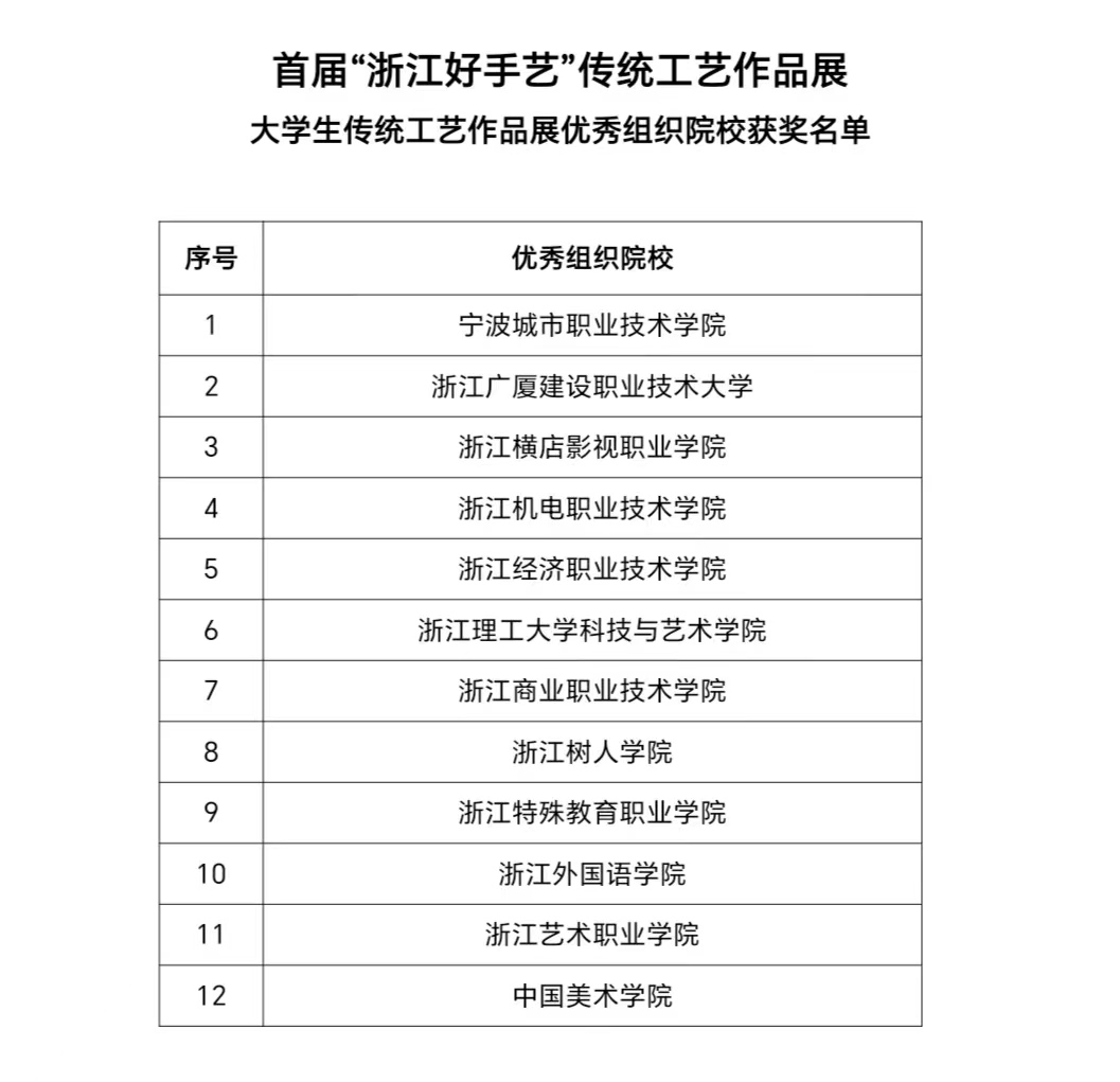 由浙江省文化和旅游厅、浙江省教育厅指导,浙江省文化艺术类职业教育行业指导委员会、浙江艺术职业学院主办的首届“浙江好手艺”传统工艺作品展——大学生传统工艺作品展已于近日圆满完成终评专家评鉴工作,共评选出优秀作品奖46项和优秀组织院校奖12项,现予以公布,详细获奖名单见附件。