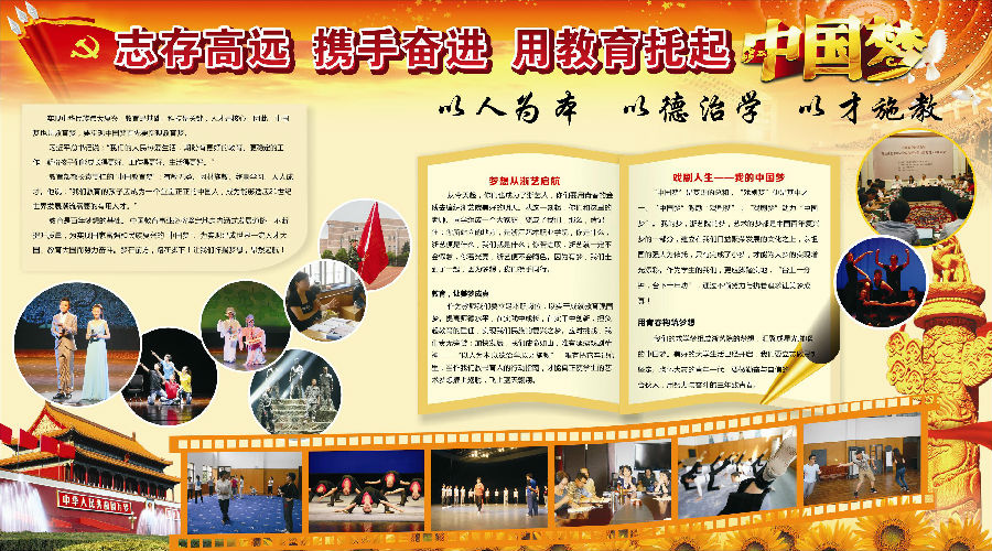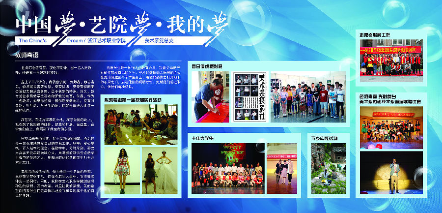 为深入学习贯彻党的十八大精神,引导全院广大学生为实现国家富强、民族复兴、人民幸福的伟大“中国梦”而勤奋学习、立志成才、积极进取,根据浙江艺术职业学院《关于深入开展“我的中国梦”主题教育活动的通知》精神,组织全院各教学单位开展“中国梦”主题教育宣传栏比赛。经过一个月的精心策划、制作,各教学系部策划制作出各具特色的“中国梦”主题宣传栏,有的反映各系教学风采和学风精神,有的反映师生对于“中国梦”的向往,有的对“中国梦”进行溯源,等等,参评作品有着较高的质量,令人耳目一新。