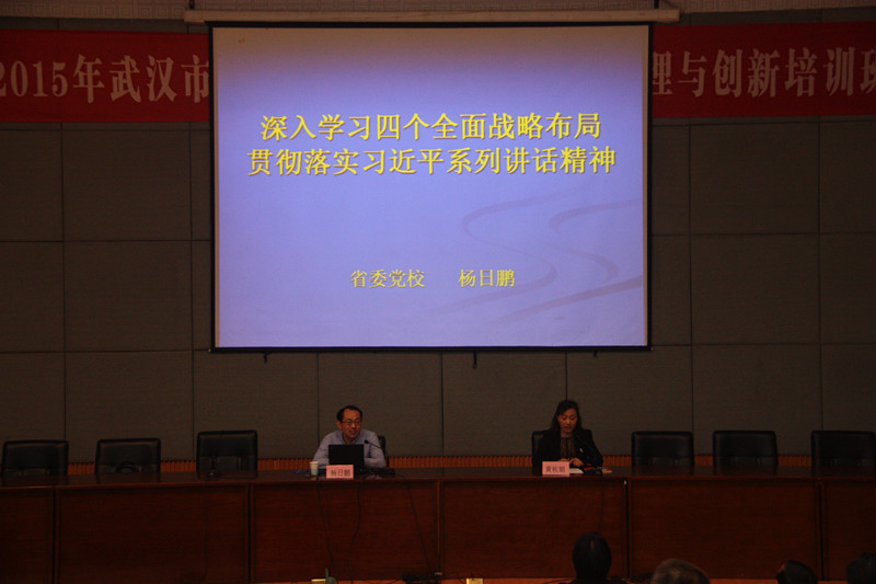 杨日鹏从准确把握“四个全面”战略布局的丰富内涵、深刻领会“四个全面”战略布局的内在逻辑、统筹协调“四个全面”战略布局的贯彻落实三个方面紧紧围绕以习近平同志为总书记的党中央提出的全面建成小康社会、全面深化改革、全面依法治国、全面从严治党“四个全面”战略布局主题,结合图片资料进行生动的阐述。他重点强调“四个全面”战略布局的内在逻辑,即全面建设小康社会是纲领性目标、全面深化改革是核心动力、全面依法治国是重要保障、全面从严治党是内在主线。在国内新常态、国际新格局这一历史新时期背景下,我们只有保持战略定力、坚定理想信念、传承中华文明才能统筹协调“四个全面”战略布局的贯彻落实。