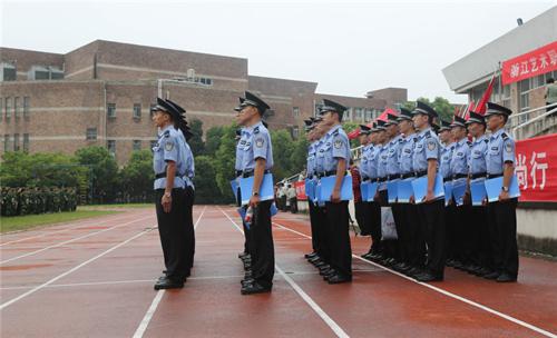 来自浙江警察学院的教官踏着铿锵的音乐,守卫着国旗出场,伴随着庄严的国歌声,国旗徐徐升起,开训仪式就此开始。