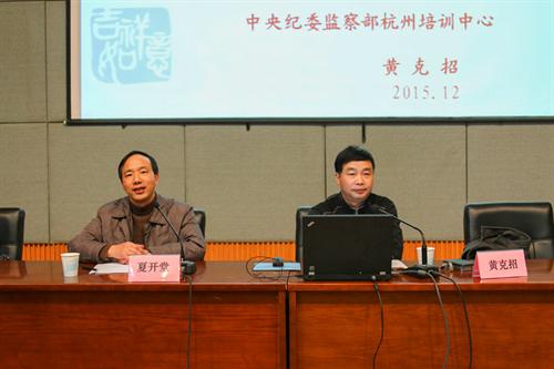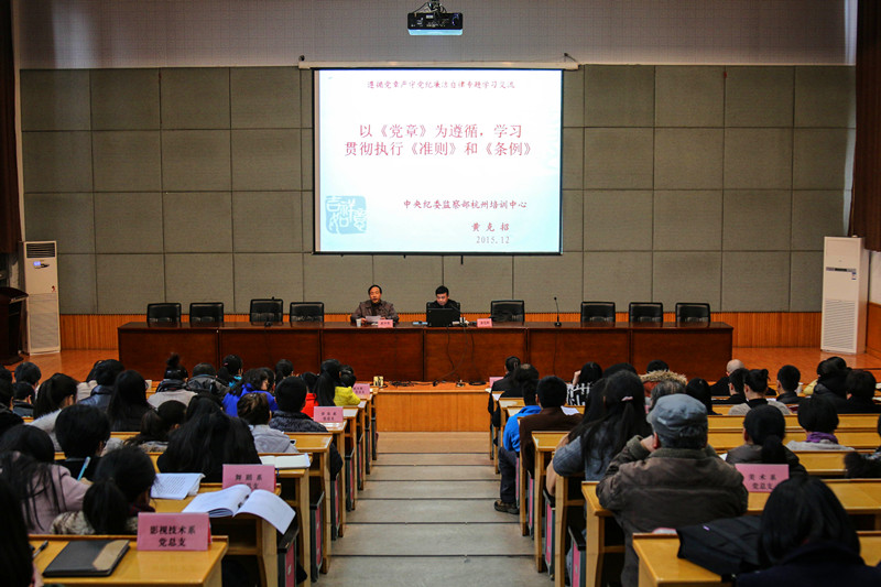 12月23日下午,浙江艺术职业学院举行党委理论中心组扩大学习会暨《中国共产党廉洁自律准则》《中国共产党纪律处分条例》辅导讲座,邀请中纪委监察部杭州培训中心主任助理、正处级纪检监察员黄克招作题为“以《党章》为遵循,学习贯彻执行《准则》和《条例》的专题辅导讲座。院班子成员、中层干部、教职工党员和学生党员代表听取讲座讲座由院党委委员、纪委书记夏开堂主持。