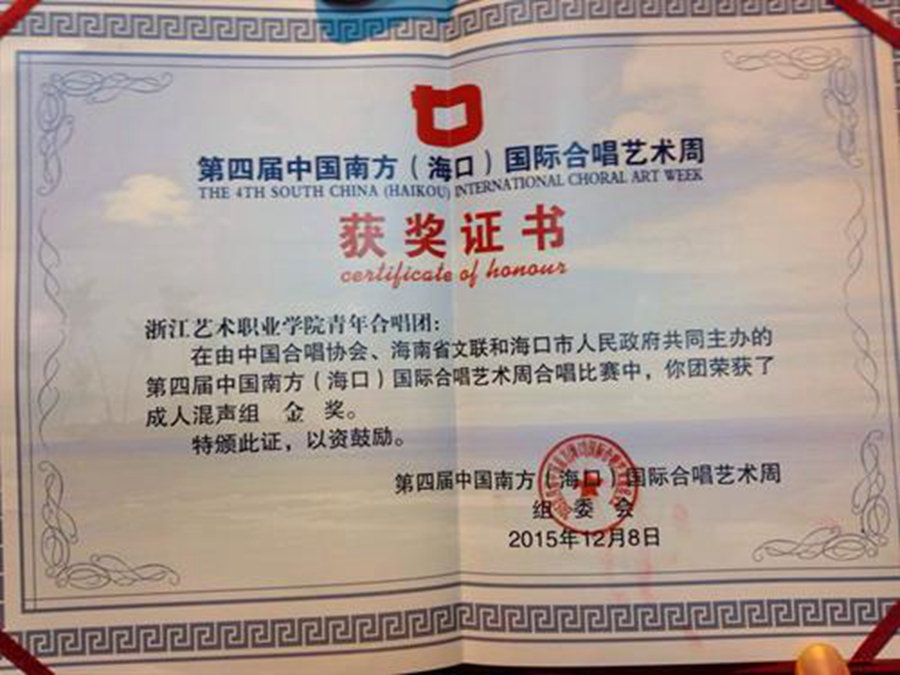 中国合唱协会、海南省文联和海口市政府共同主办,海南省合唱协会和海口市文体局共同承办的第四届中国南方(海口)国际合唱艺术周于12月5日-9日在海口市人民大会堂举行。浙江艺术职业学院青年合唱团作为浙江省唯一一支参赛团队,喜获成人混声组、成人女生组、成人声乐组合(男声)组三个组别的金奖,合唱团指挥费小龙荣获优秀指挥奖。