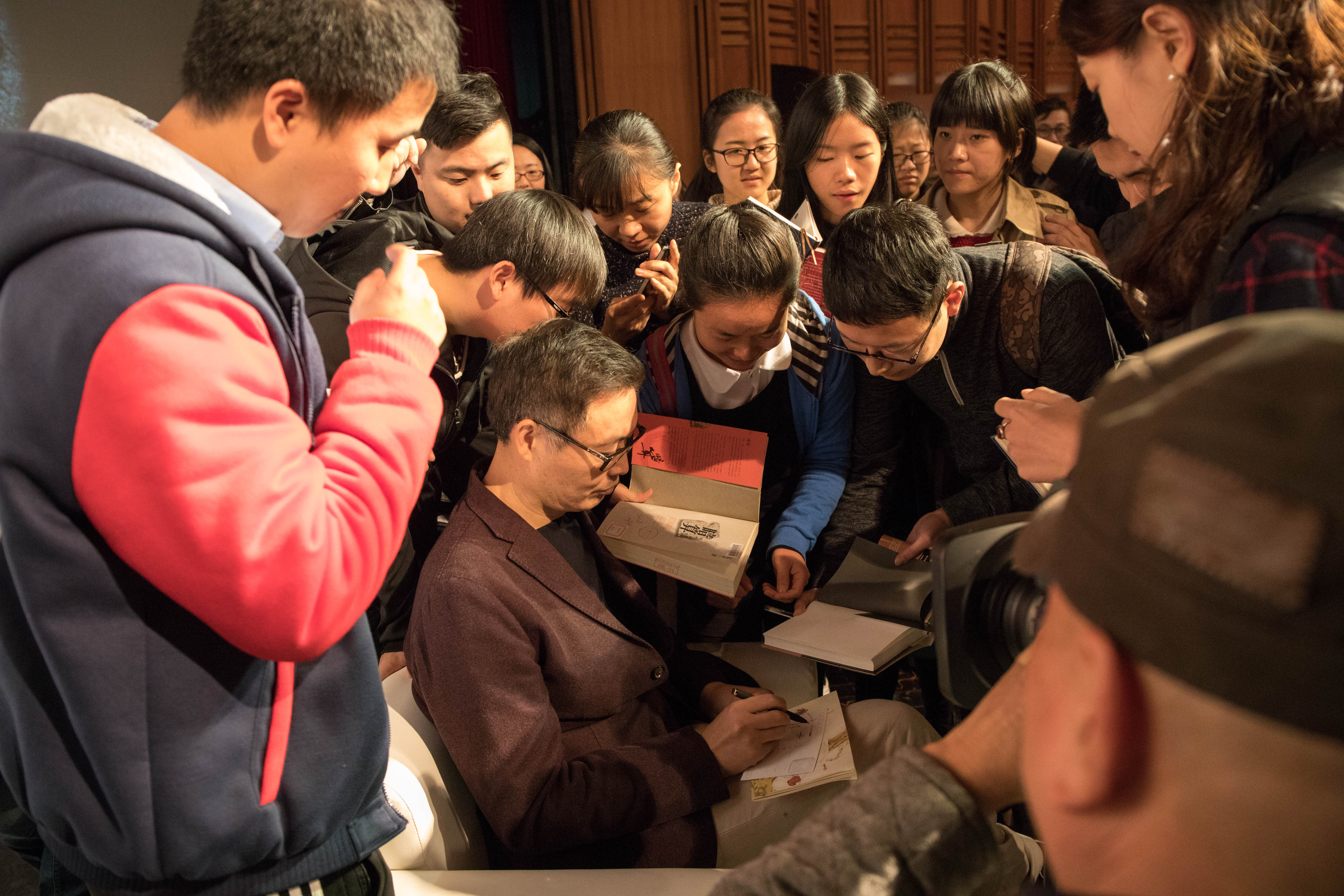 最后,麦家与观众合了影,并单独给喜欢他的读者签名合影。