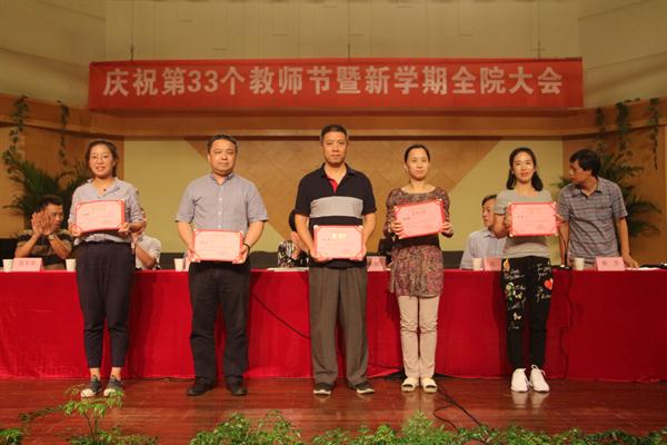党委委员、副院长夏开堂宣读2016年度院级先进集体和个人(含优秀干部、优秀教师、优秀教育工作者)、院级先进党组织和优秀共产党员、厅级以上优秀团队和人才称号、挂职锻炼人员年度考核优秀人员表彰名单,党委委员、副院长沈恒宣读2016-2017年度学院在各类重大赛事中的获奖表彰名单。院领导为获奖集体和个人颁发奖证奖牌。