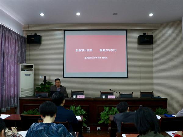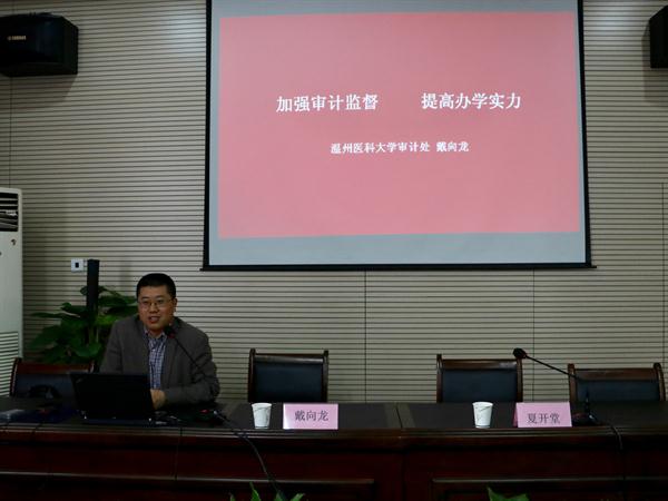 本次培训会特邀温州医科大学审计处处长戴向龙作题为《加强审计监督 提高办学实力》的讲座。戴向龙结合自身工作经验,系统阐述了纪检、监察、巡视、审计的基本概念、主要特点和重点环节,深刻分析了推进内审工作的重要性和紧迫性,并以案例为支撑,重点围绕审计发现的十类具体问题,对学校如何推进审计工作,加强党风廉政建设提出了具体建议。