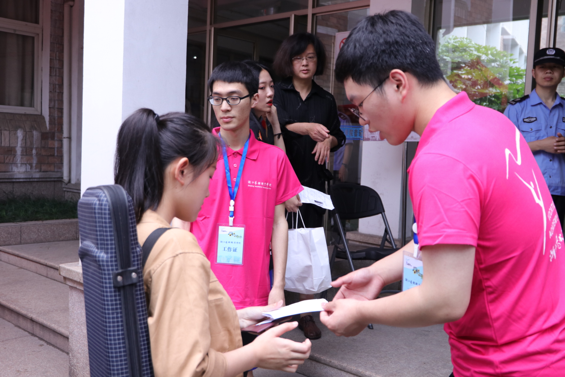 上午淅淅沥沥下起了雨,学校在音乐厅候考区和4号楼考场之间,用遮阳棚搭起一条七彩通道,以免考生淋雨,也保护了考生的乐器。尽管学校准备了充足的室内休息区,还提供茶水等,家长们依然宁可冒雨站在音乐厅外等候。在孩子通过七彩通道走向考场的时候,给他们送上一句,别紧张,好好考。一位家长说:“省艺校在我们那里很有名的,我们文化馆的老师能到省艺校培训都是很光荣的,现在叫浙江艺术职业学院了,艺术教育那肯定是厉害的。我孩子自己也蛮喜欢艺术的,所以她想要来考,我就支持她。毕竟孩子自己喜欢的东西学起来比较有动力的,希望她这次能够取得好成绩!”